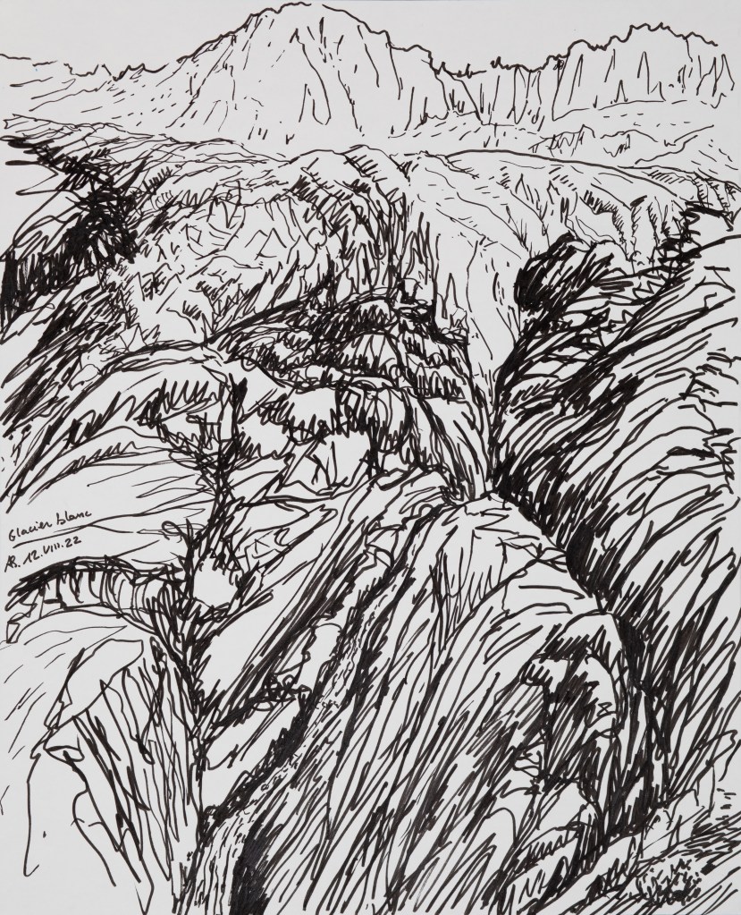 Le travail sur les glaciers est encore en recherche. Je suis au stade où j’expérimente différentes techniques. J’ai commencé en noir et blanc à l’encre alors que cela faisait plusieurs années que j’étais tournée vers la peinture pour mes travaux sur la lumière de la nuit par nécessité. Quand tu peins à la lumière de la nuit, à l’aveuglette, c’est compliqué d’être dans un geste précis de dessin. Avec la peinture, je reste plus suggestive. Pour les glaciers, comme j’étais dans des lieux inconfortables, assise sur un caillou, presque en équilibre, je n’ai pas l’espace pour poser des encres ou des boites d’aquarelles. J’utilise des sortes de feutres-pinceaux japonais remplis d’encre Rohrer, qui est plus mate que l’encre de chine mais avec le même noir intense. J’utilise aussi des pinceaux fins ou des feutres d’encre pigmentaire qu’on utilise pour les dessins techniques en architecture et design.