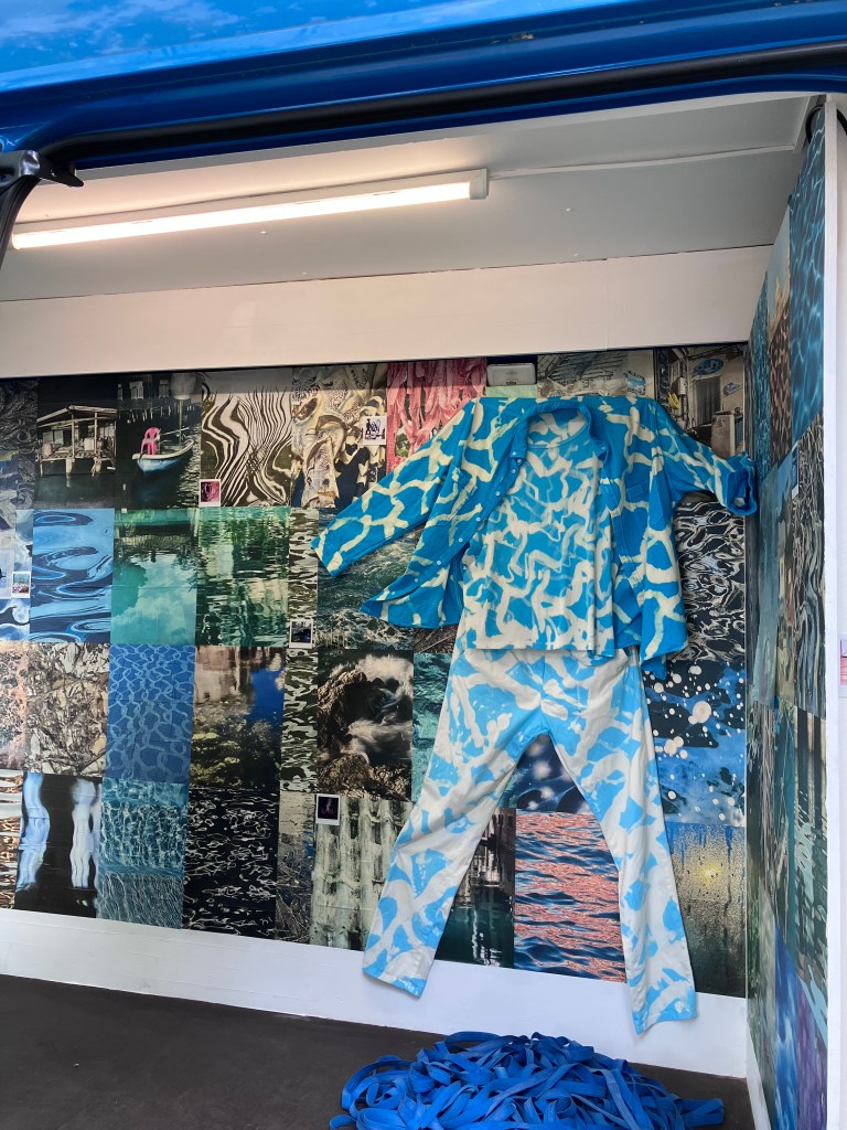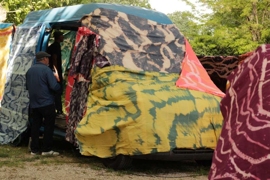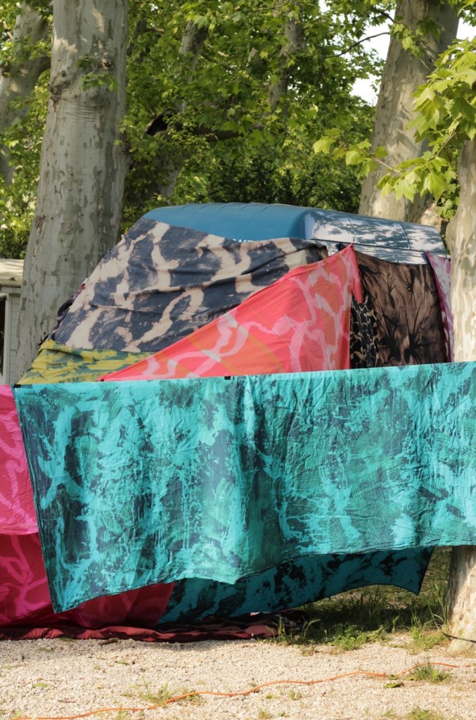 C’est un espace feuilleté et enchevêtré : un camion cabanon et grotte, la grotte Laurent. (2)A l’intérieur polypier d’images, les images nous traversent nous constituant, collées directement sur le support, mise en abimes diverses, c’est pour moi l’équivalent d’une mémoire. A l’extérieur feuilletages modulables des tissus qui retrace mes sensations de baignades. Pour ce projet, j’ai continué mon travail sur les reflets et les mouvements de l’eau avec la peinture soustractive sur des foutas et des grands tissus. On y retrouve le motif des reflets de l’eau qui se transmet partout, tous ces motifs un peu chatoyants qui donne la trace des gestes. L’idée générale, c’est qu’il n’y a plus d’intérieur ou d’extérieur. À l’intérieur du camion, il y a des photos qui représentent cette idée de mondes maritimes. Je voulais faire un objet complet qui reprenne cette idée de tisser le dedans avec le dehors.