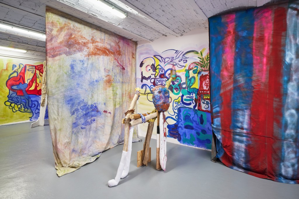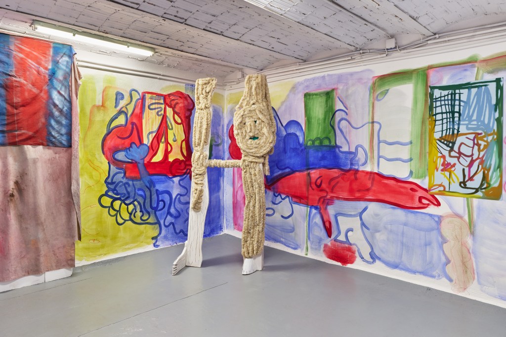 De la même manière que je peux rapidement investir un espace domestique et ne jamais laisser l’endroit neutre ou vide, ici c’est une superposition de gestes : une peinture murale, des dessins que je fais sur mon téléphone quand je n’ai pas accès à un carnet, comme des peintures numériques imprimées sur toile. Ce sont différents gestes de peinture qui sont montrés et, toujours, ce rapport au tissu, au tressage, comme une habitude sur la plupart de mes installations. C’est un geste que je fais naturellement, une occupation que j’ai dans la vie de tous les jours pour rentrer dans une méditation. Je me retrouve très rapidement avec des kilomètres de tresses : venir déchirer des draps, les tresser. Un peu comme l’image qu’on a de personnes enfermées qui pourraient s’échapper par la fenêtre en utilisant leurs draps pour créer une corde. Utiliser une issue de secours. S’inventer une manière de s’échapper, ça a toujours été présent dans mon rapport à l’art. C’est une manière de s’émanciper, de sortir de son quotidien, de ce que la société nous induit à faire. C’est le moyen de trouver une porte de sortie. Avant de commencer à étudier l’art, j’étais ouvrier dans une usine agroalimentaire et ça a vraiment été une respiration. Comme si, tout d’un coup, on m’enlevait mes œillères et que je pouvais voir l’intensité de la vie et comment elle pourrait être vécue d’une autre manière. Il y a juste un clin d’œil dans une peinture sur bois, qui reprend vaguement le schéma d’un plan d’évacuation. Elle ne sera pas forcément au mur, peut-être qu’elle servira à fabriquer un personnage. En tout cas, il y a toujours cette idée de plan B, d’essayer de trouver des alternatives à la survie.
