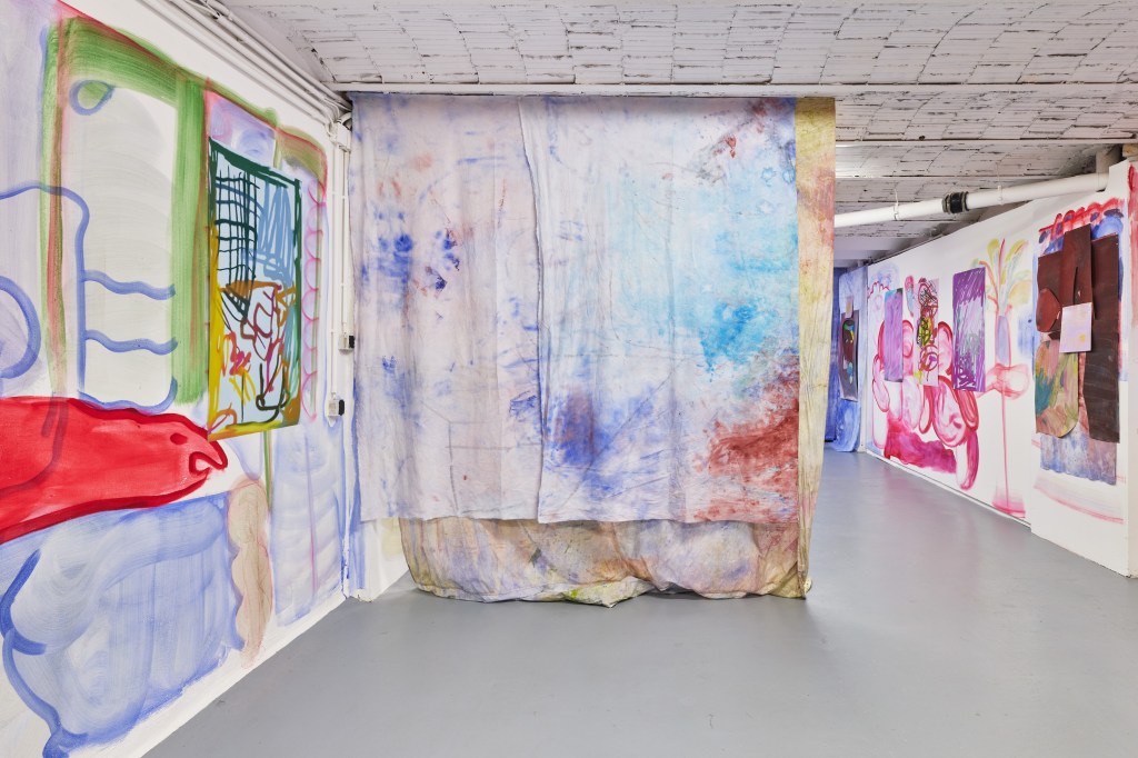 Il y a forcément des figures qui me suivent pendant mon travail, mais je n’y pense jamais vraiment quand je commence à travailler. Il y a aussi cette fascination pour le drapé chez les peintres classiques hollandais. Avec cette différence que, chez eux, il y a quelque chose de plus romantique. Moi, j’aime bien travailler avec des draps, venir révéler des plis et des ombres, comme des petites beautés du quotidien, quand la lumière du matin vient taper sur un lit mal fait, des draps froissés. Après, il y a des artistes comme Jessica Stockholder ou Curtis Cuffie que j’aime beaucoup. Oscar Murillo, ou encore Supports/Surfaces. Le bleu et le rouge sont très présents, simplement parce que ce sont les pigments que j’ai en plus grande quantité. C’est assez terre à terre : utiliser en premier ce que j’ai sous la main. Je viens avec un ensemble de pigments, je me limite à ces couleurs-là et je me limite à ce que j’ai. Il y a un côté très naïf, très enfantin. Quand j’ai commencé à peindre sur les murs, j’ai réalisé que c’était un rêve que j’avais depuis enfant : investir le mur de ma chambre de la manière dont je veux. Il fallait que je le fasse. J’ai déjà fait des expositions avec de la peinture murale, mais c’était souvent pour créer une atmosphère. Ça n’a jamais été aussi illustratif. J’utilise aussi souvent le rouge et le bleu comme les lignes d’une feuille avec une marge, mais ici ce n’est pas vraiment ça.