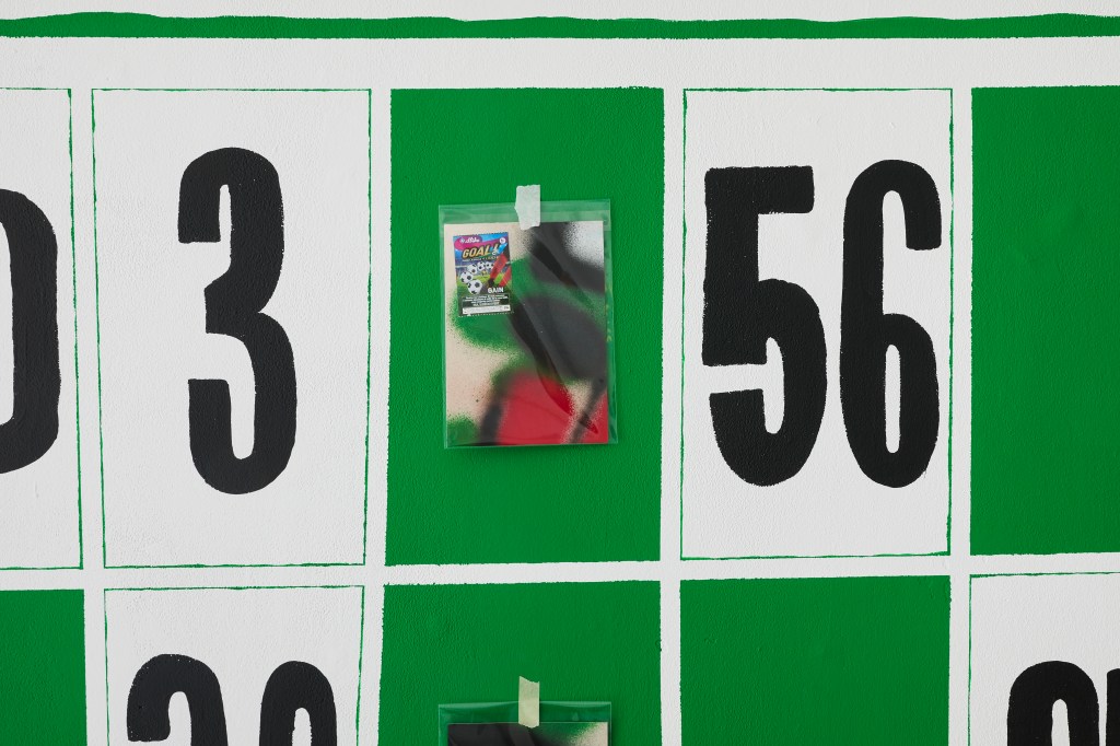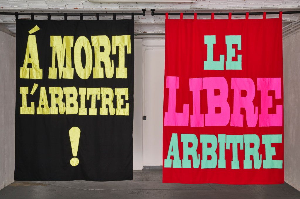 Je travaille depuis longtemps les bannières en textile, mais en général elles fonctionnent de façon solitaire. Pour cette exposition, dans l’histoire du jeu, de l’aller retour, j’avais envie d’en faire deux et que ce soit une question/réponse, une sorte de dialogue, un peu comme une séquence. Pour moi, c’est un ensemble de deux bannières. Un des médiums de communication des supporters, c’est quand même la bannière donc j’avais envie de reprendre cette manière de s’exprimer, cette façon de dire quelque chose par écrit, mais à haute voix. Il y a un film que j’adore qui s’appelle « À mort l’arbitre » de Jean-Pierre Mocky et j’ai repris le titre directement.