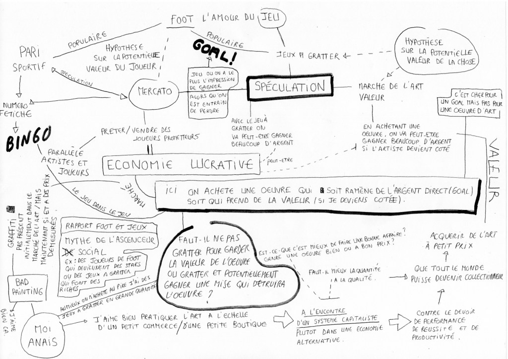 Tu m’avais parlé de ton envie de travailler sur le football féminin et à partir de là, j’ai commencé à réfléchir à ce que ce sujet pouvait m’inspirer. J’avais déjà fait un projet sur le foot et ce qui me plaisait, c’était l’idée de faire équipe, de faire communauté. J’avais créé un foot dans lequel les gens jouaient avec une bille de bois en portant des sabots. J’avais fait des t-shirts avec que des vieux mots type « chèvre », « semelle », « balle de plomb » qui ont des significations dans le monde du football, mais qui, pour des amateurs, n’ont pas beaucoup de sens. C’était un jeu qui était plutôt technique. Les personnes ne courraient pas beaucoup avec leurs sabots, le ballon faisait mal. C’était un peu du non-jeu. Je ne voyais pas comment adapter ce projet à la Galerie Ambulante puisque que je ne serais pas là pour l’animer et je ne voyais pas comment faire équipe avec des gens que je n’allais pas rencontrer.